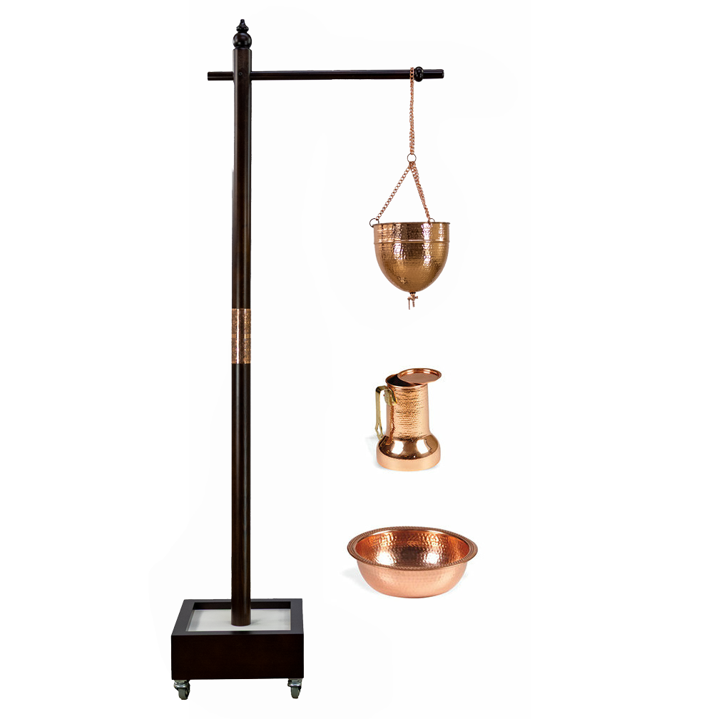 Our attractive Mitra Shirodhara Oil Stand features solid beech wood, copper, and a sturdy base with locking casters. Whether you offer Shirodhara currently or are considering adding it to your menu, the stability, quality, and beauty of the Mitra’s design makes it an attractive option. The hand-crafted solid copper Shirodhara vessel, collection bowl and pitcher are sure to brighten up your room’s decor. Rounding out the copper accents, a casted copper decorative band secures the two-piece beech pole, adding another touch of copper to the usual wooden construction. The hanging vessel is fitted with an oil release and stop valve which is accurate and easy to operate. The weighted base with locking casters offers mobility with stability. The Mitra Shirodhara Set fills a void in the USA for an authentic, well-crafted Shirodhara treatment set.