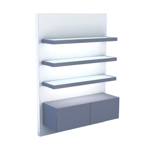 48" de ancho x 69" (83" con la caja de luz) de alto x 18" de profundidad. Estructura de metal, estantes de metal con vidrio esmerilado, paneles traseros de metal y gabinete de metal con acabado de pintura en polvo. (2) cajones en el gabinete base para almacenamiento. (3) luces LED de 36", 4100K + (1) fuente de alimentación (110v 108W máx.) para iluminación debajo del estante.