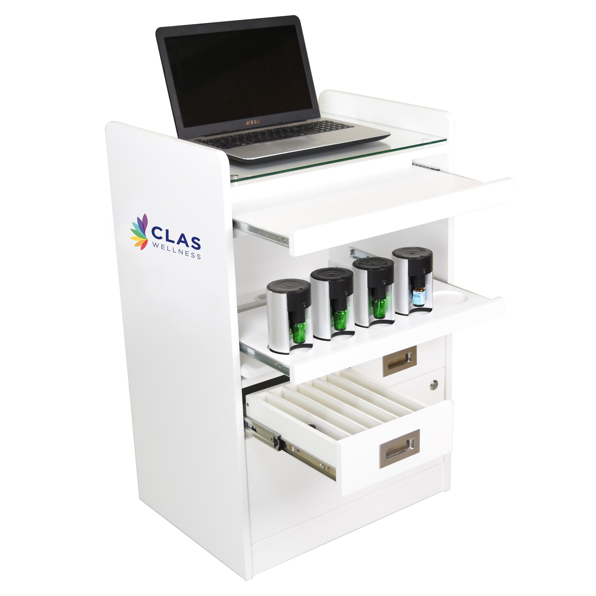 This multi-functional, beautifully-crafted cart was designed specifically to house all the components necessary to deliver a CLAS Wellness session. Your CLAS computer sits on a glass top shelf with a pull-out tray beneath it to hold session notes or any other materials needed for the session. The second pull-out tray has 5 indented receptacles that hold the aromatherapy diffusers securely. Three more drawers hold all the tools you need when combining the CLAS session with a massage, facial, or other menu item. Designed with sleek lines in contemporary white to complement the CLAS Lounger.